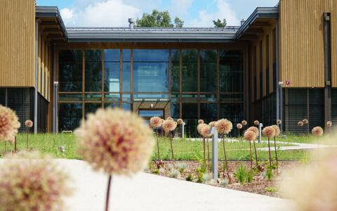 Pie ēkas galvenās ieejas izvietoti apstādījumi un dekoratīvās bruģa joslas, kuru ritms akcentē ēkas arhitektūru. Līdzās ēkai atrodas velosipēdu novietnes, soliņi, atkritumu urnas un karogu masti. Rekreācijas zonā - uz nogāzes ēkas Ziemeļrietumu malā izvietoti dekoratīvi soli – brusas, bet teritorijas Ziemeļaustrumu stūrī novietota ugunskura vieta ar terasi un lapeni.